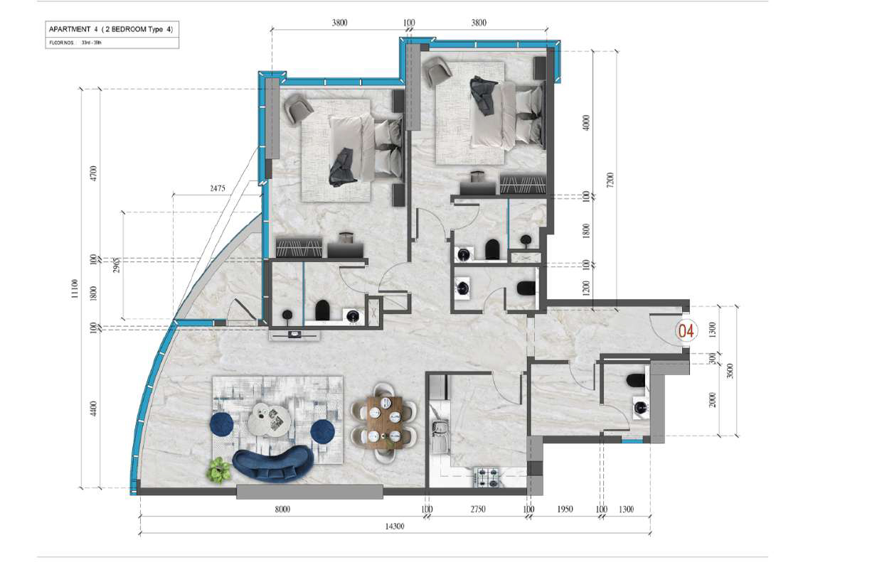 Floor plan of  Renad Tower 2 Apt4-2BRM-Type-4 - - 4 - - -